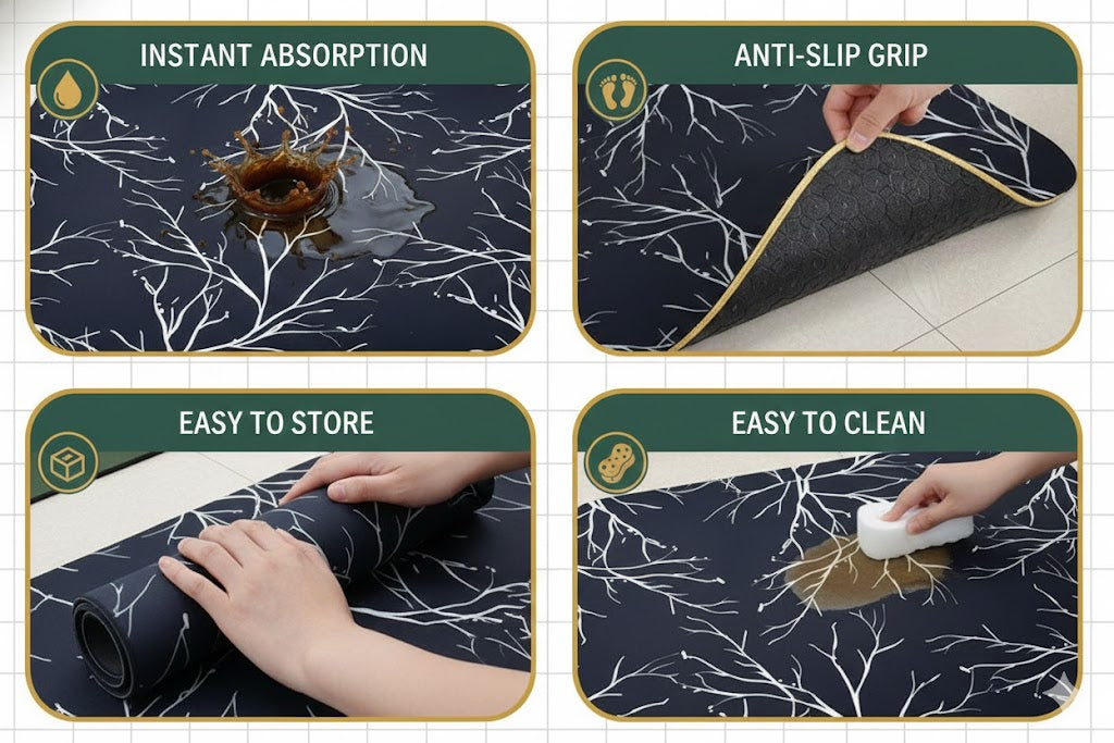 Yes. CozyMat™ is designed to absorb water the moment it touches the surface, helping keep your sink and stove area dry. This prevents puddles, slippery floors, and repeated wiping throughout the day.